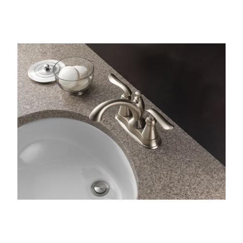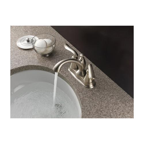 DELTA® Centerset Lavatory Faucet, Series: Tract-Pack™, Linden™ Collection, 1.2 gpm Flow Rate, 4 in Center Distance, Rigid Spout, 4-7/8 in Spout Reach, 4-1/2 in Spout Height, Lever Handle, 2 Handles, 50/50 Pop-Up Drain, 3 Faucet Holes, 3/8 in Connection, Compression Connection, 2-1/4 in Maximum Deck Thickness, Deck Mounting, DIAMOND™ Seal Valve, 9-5/8 in W x 5-3/4 in H Dimensions, Brass, Stainless Steel, Domestic, Commercial Commercial/Residential