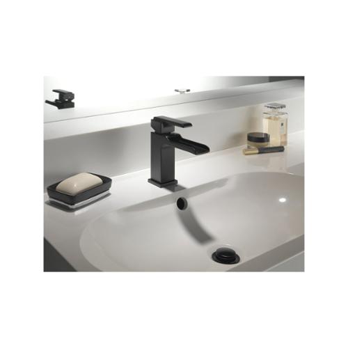 DELTA®, 568LF-BLLPU, Centerset Lavatory Faucet, Ara® Collection, 1.2 gpm Flow Rate, Open Channel Spout, 5-1/4 in Spout Reach, Lever Handle, 1 Handles, 3/8 in Connection, Compression Connection, 2-1/4 in Maximum Deck Thickness, Deck Mounting, Ceramic, 8-3/8 in H Dimensions, Brass, Matte Black