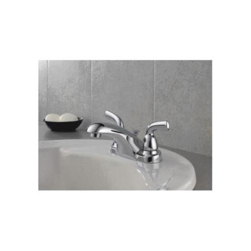 DELTA® Centerset Lavatory Faucet, Foundations®, 1.2 gpm, 4 in Center Distance, Fixed Spout, 4-5/16 in Spout Reach, 2-1/2 in Spout Height, Lever, 2 Handles, Pop-Up Drain, 3 Faucet Holes, 1/2-14, NPSM, 1 in Maximum Deck Thickness, Deck Mount, Washerless Stem Valve/Cartridge, 3-3/4 in H, Metal, Stainless Steel, Import, Commercial