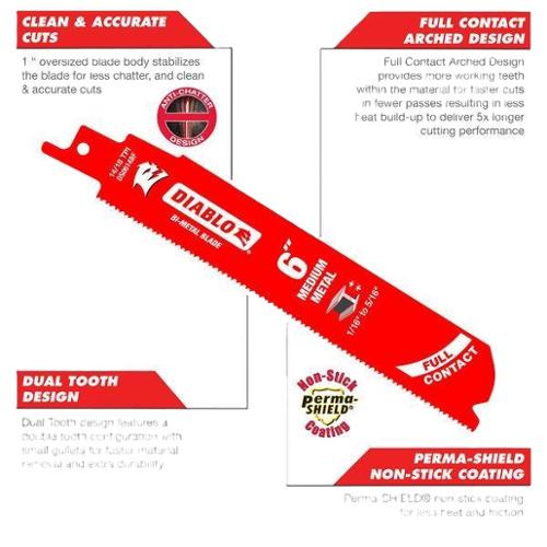 Full Contact Arched Design provides more working teeth within the material for faster cuts in fewer passes resulting in less heat build-up to deliver 5x longer cutting performanceDual Tooth design features a double tooth configuration with small gullets for faster material removal and extra durabilityPerma-shield coating protects the blade from heat, gumming, and corrosion1 in Demolition body for straighter cuts with less vibration