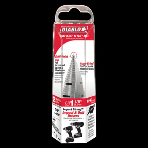 Diablo®, DSD1125S17, Drill Bit, Impact Step, 3-1/32 in Overall Length, 17 Steps, 2 Flutes, 1/4 in Shank, Hex Shank, 132 deg Point, Split Point, Applicable Materials: Plastic/Steel