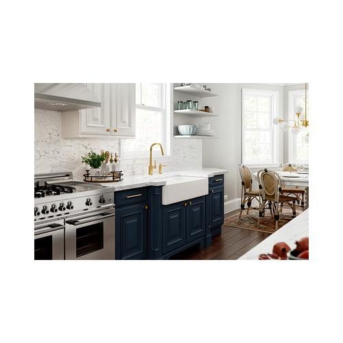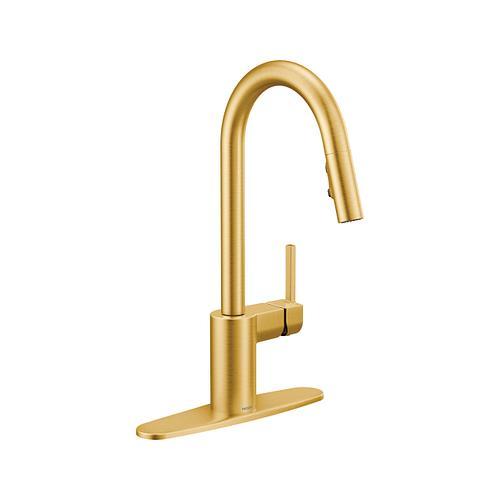 Moen®, 7565BG, Kitchen Faucet, Pull-Down, Series: 7565, Align™ Collection, 1.5 gpm Flow Rate, High-Arc Spout, 7-17/32 in Spout Reach, 9-1/2 in Spout Height, 68 in Hose, Lever Handle, 1 Handles, 1 Faucet Holes, 1-1/2 in Faucet Hole, 3/8 in Connection, Compression Connection, Spray Pattern: Aerated Stream, Function: Traditional, 2 Spray Functions, 2-1/2 in Maximum Deck Thickness, Deck Mounting, 1255 Duralast™, 4.53 in W x 12.25 in D x 15.63 in H Dimensions, Metal, Brushed Gold, Domestic, Commercial Commercial/Residential