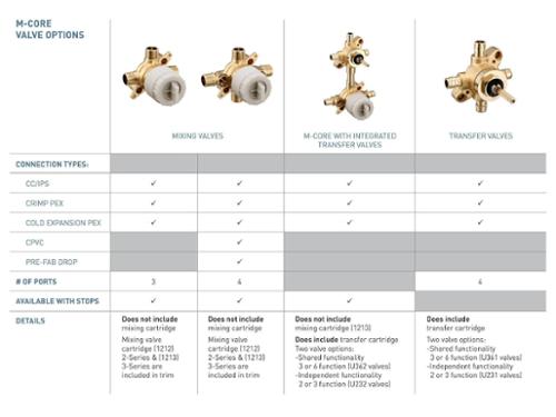 IMPORTANT - When using 3 Showering Devices, transfer valve cartridge must be modifiedSimple Cartridge Modification changes the valves flow from two outlets to three outletsSee Transfer Valve Instructions for additional informationCaps are not included with the transfer valvesM-CORE valves, with 3-Series trim, have pressure-balancing capabilities designed to control temperature fluctuations in the event of water pressure changes in the homeFeatures volume control, allowing you to adjust the flow of water for greater functionalityImproved style options, including the perfectly matched mixing and transfer trim, are availableOffers design flexibility to choose your trim after the valve installation, so you can take your time with your style and finish selectionsM-CORES adaptability allows the valves to be roughed in with the option of functionality and style changes that dont require removing or changing the valve(s)