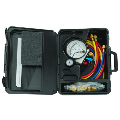 This backflow preventer test kit, model TK-99E, is made for testing pressure vacuum breakers, anti-spill vacuum breakers, reduced pressure zone assemblies, and double check valve assemblies. It is easily connected for accurate testing of differential pressure, air inlet vent opening, pressure drop, and tightness against reverse flow that visual inspections cannot locate. It consists of a gauge with color-coded valves and hoses, hose adapters, shock cord for easy mounting, supply pressure gauge, and carrying case. This compact portable kit is designed for simplified operation and rugged reliability. Maximum working pressure is 200 psi (13.79 bar).